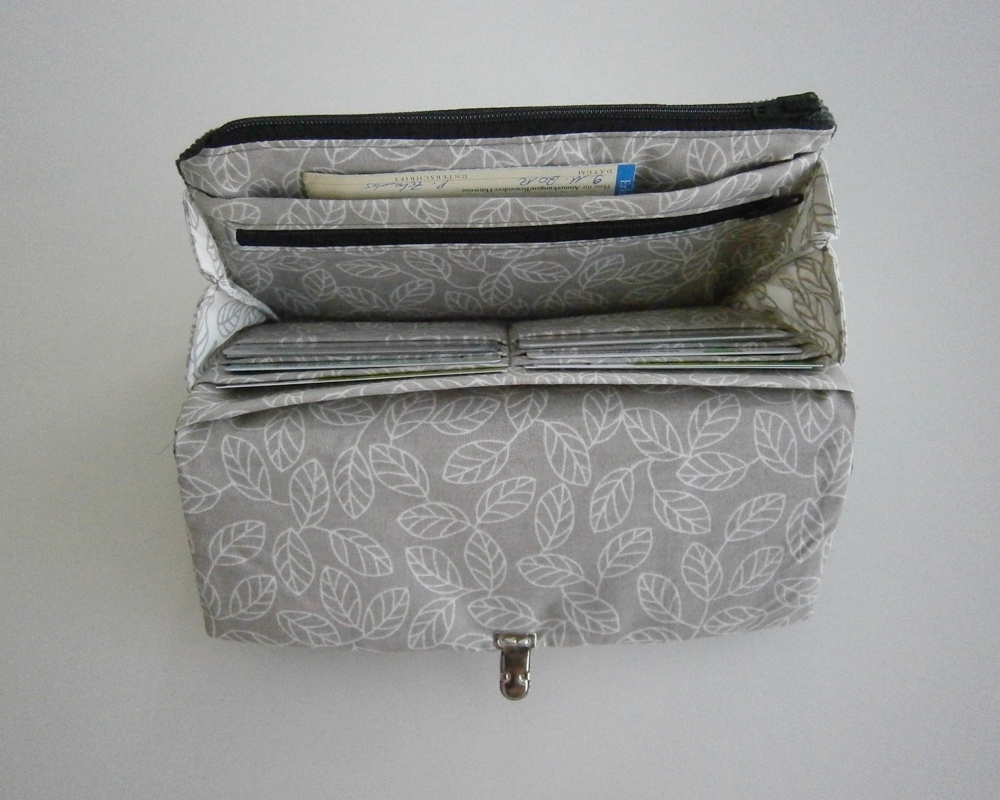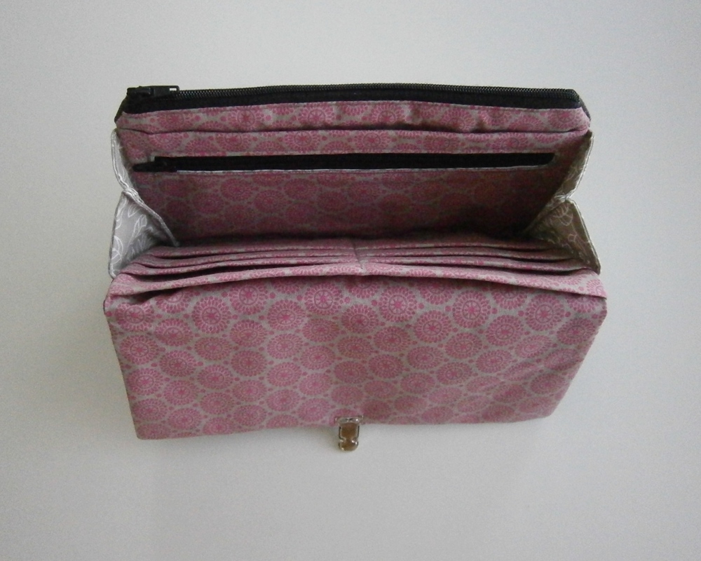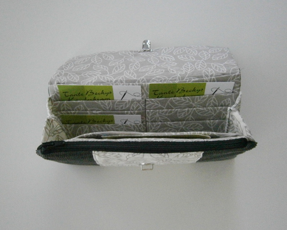 Der Geldbeutel hat ein großes Münzfach und ein kleines Reißverschlussfach, ein großes und ein kleines Einsteckfach und sechs Kartenfächer, in die jeweils 2-3 Karten passen.